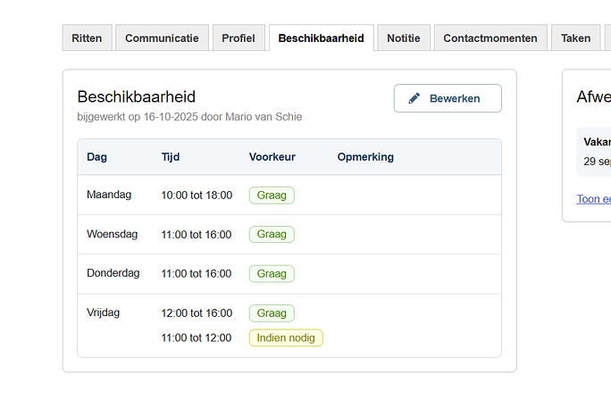 In onze vorige update hebben we afwezigheid een prominente plek op de CRM kaart gegeven en samen met beschikbaarheid (‘graag’ of ‘indien nodig’) staat er een solide basis waar we in de toekomst op verder kunnen bouwen. Het score model in RegiMatch zal hier per direct gebruik van gaan maken.