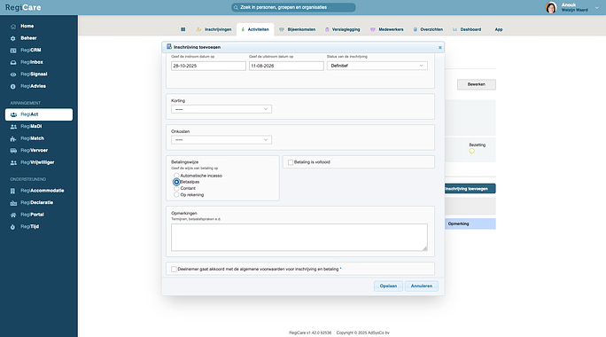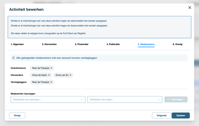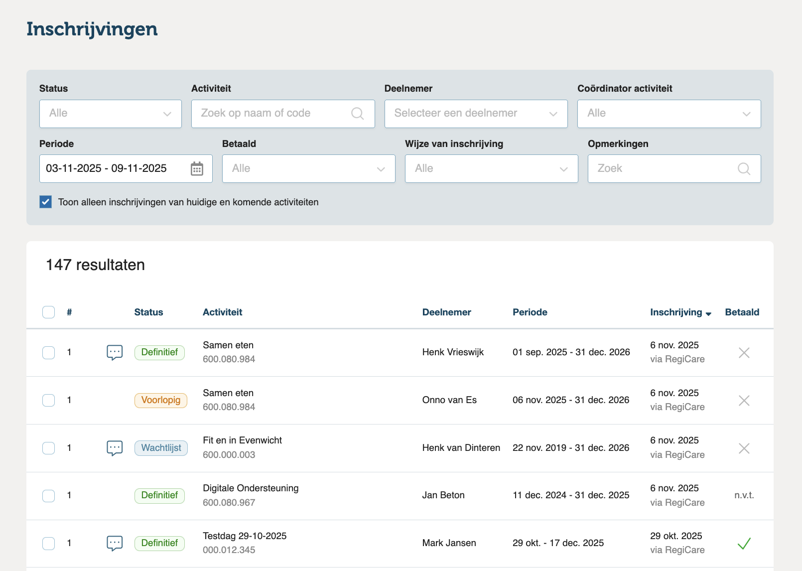 Inschrijvingen voor alle activiteiten zijn nu te vinden in een nieuw centraal overzicht, inclusief verschillende filteropties voor onder andere deelnemers, coördinatoren en opmerkingen.